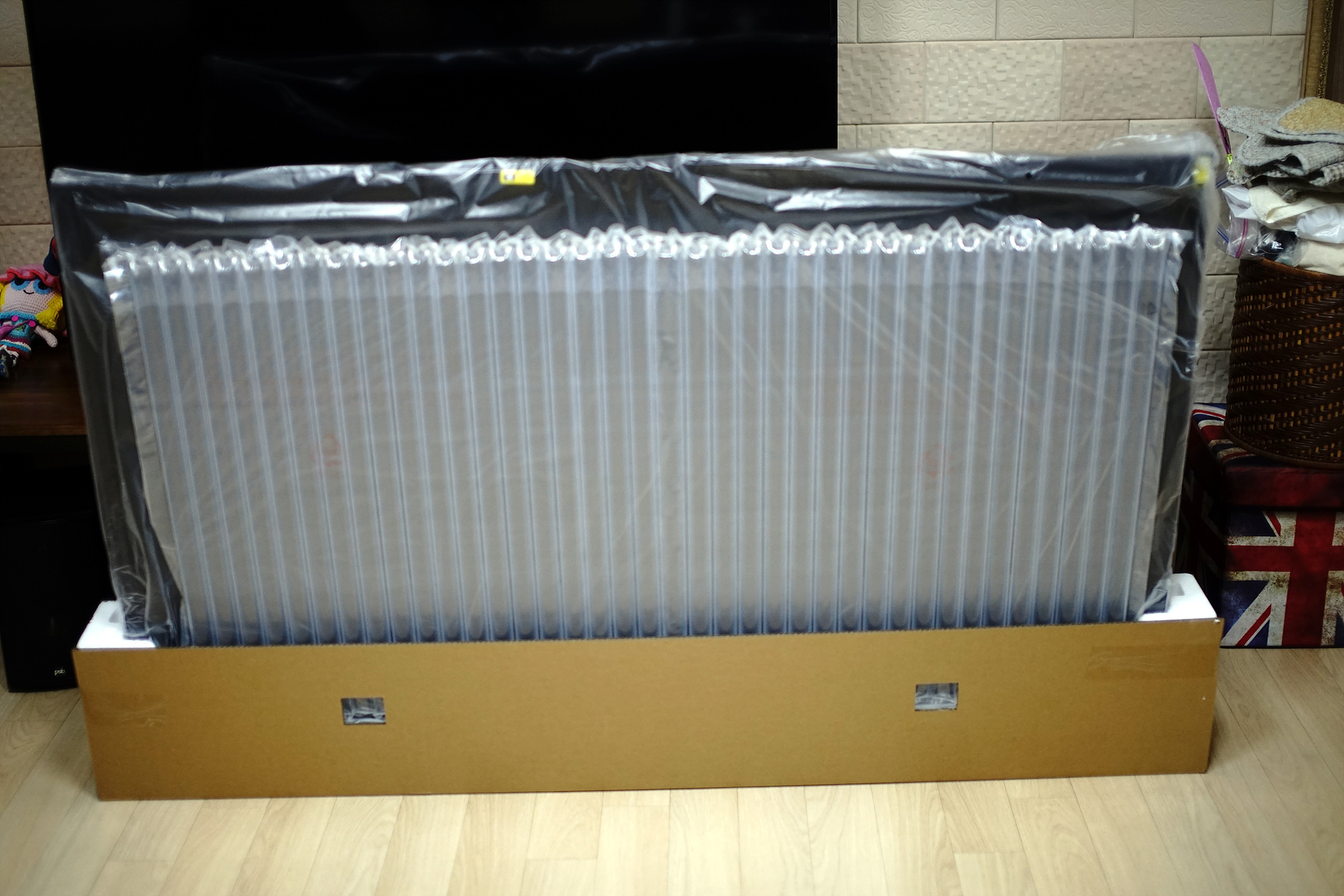 고정핀을 제거하고 위로 박스를 열면 충격방지 완충제로 쌓인 tv가 모습을 드러낸다.